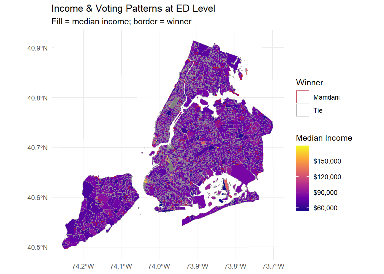 Mamdani ran a dynamic and successful campaign that spoke to issues affecting a broad swath of New Yorkers. In particular, he spoke to the issue of public safety and affordability whilst also keeping in step with issues of national origin, increasing violence towards immigrants, and took a strong stance against ICE. When we look at the data we see that this message rang through for New Yorkers who are middle to low income and New Yorkers who represent the increasing diveristy of the city.