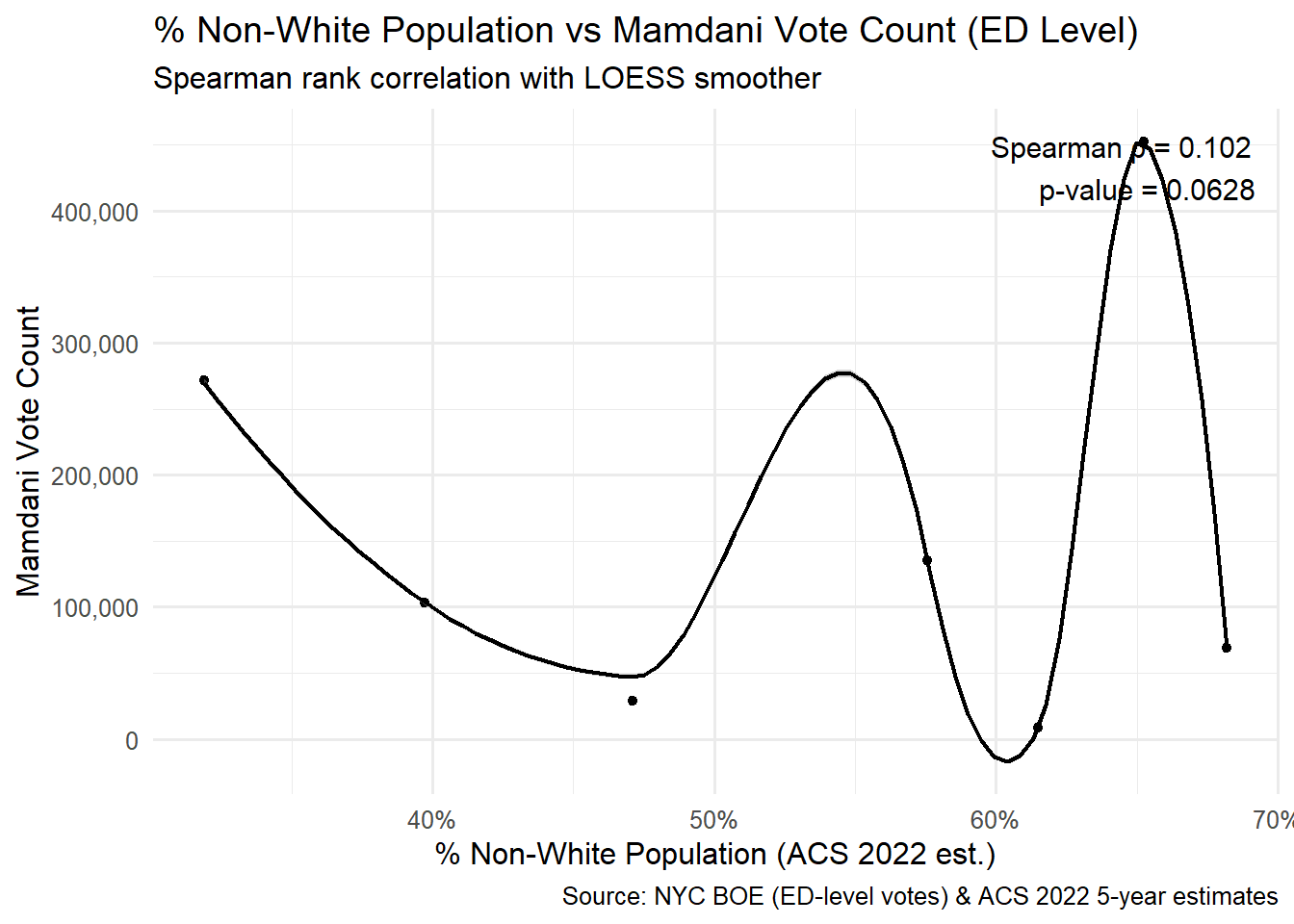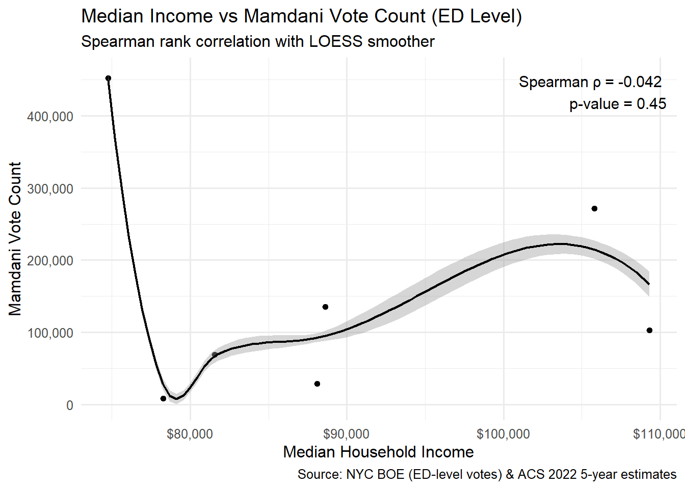 A Spearman rank correlation was used to assess the monotonic relationship between median household income and Mamdani vote counts at the election district level. Concerning median income, The correlation indicates a modest association, suggesting that districts with higher median incomes tend to contribute somewhat more Mamdani votes in absolute terms. However, the LOESS smoother reveals a nonlinear pattern, with vote accumulation concentrated in middle-income districts and diminishing marginal increases at the highest income levels. This suggests that Mamdani’s electoral support is geographically concentrated rather than uniformly stratified by income.
